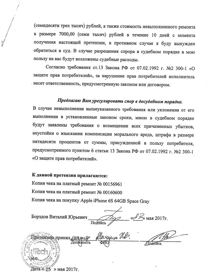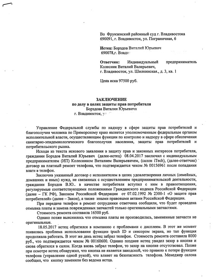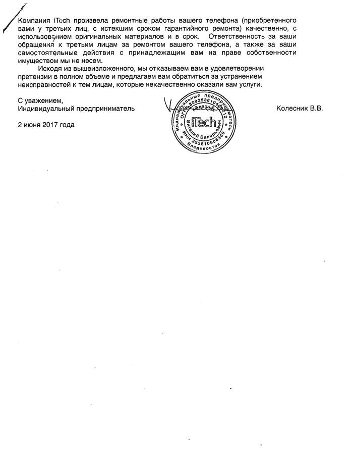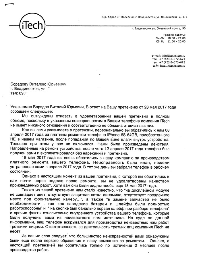 Вообщем в декабре 2016 года я приобрел iphone 6s. В апреле 2017 года на рыбалке в забродни попала вода, и соответственно попала в телефон (да дурак, забыл выложить телефон в авто), приехал домой (то еще приключение по бездорожью сопок о.Русский с заклинившей помпой и слетевшем ремнем генератора) закинул трубку в плошку с рисом и оставил до открытия сервиса, так как уже была ночь. На утро закинул телефон в ремонт, в салон iTech. Сервис выбирал по отзывам и это стало моей ошибкой, на тот момент я еще не знал про авторизованные сервисные центры, наличие оригинальных запчастей, ростесты и прочее. При звонке в данную контору и при передаче телефона в ремонт, мне не один раз ответили, что будут использованы только оригинальные запчасти. Договор со мной не заключали, акты приема-передачи не составляли.