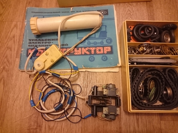 Основу составлял этот редуктор с пультом управления и блоком для батареек. И все, что можно было собрать ездило и двигалось. Вот несколько примеров: