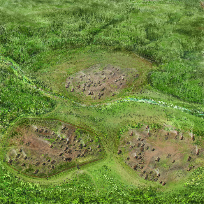 В трех соседних деревнях с помощью геомагнитных измерений были идентифицированы 313 домов. Одновременно было заселено до 80 домов – исключительная плотность населения для этого периода. Юго-западное из трех поселений было окружено двойным рвом длиной 1,3 км и таким образом отделено от остальных. Некоторые районы были укреплены частоколами.