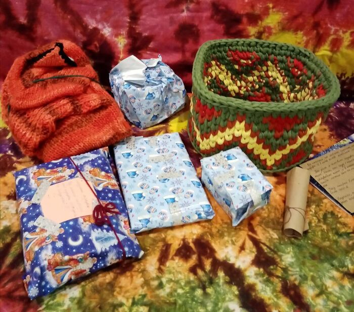 Куча сверточков, приятные и трогательные записки, открытка с душевными словами. Мммм....