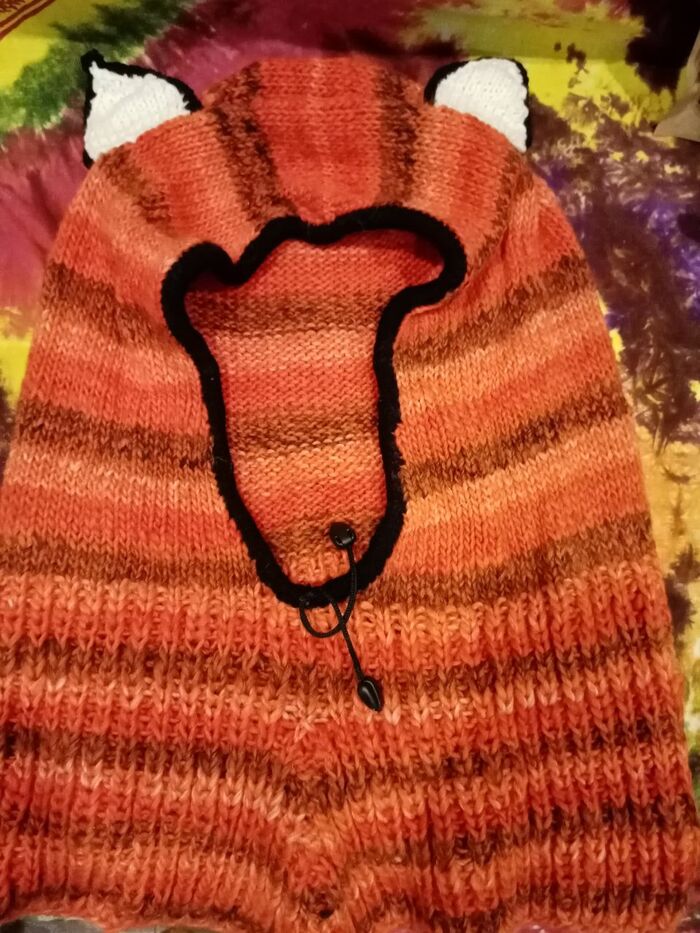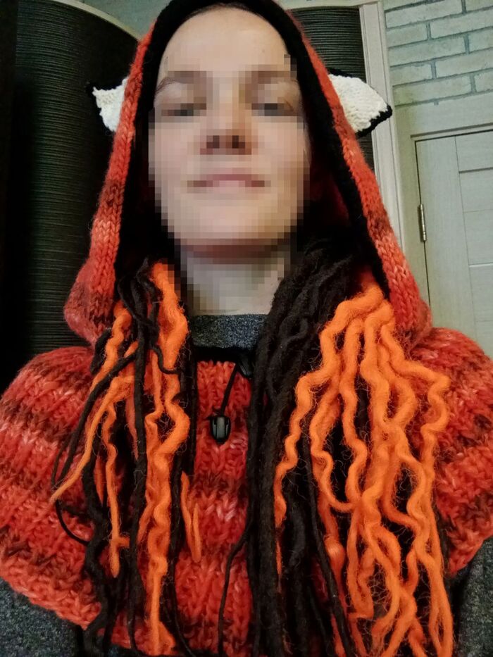 А вот дальше - та самая прелесть, которая сделала мой сегодняшний день счастливее! Обалденный, яркий снуд-манишка-капюшон ручной работы! С лисьими ушками!