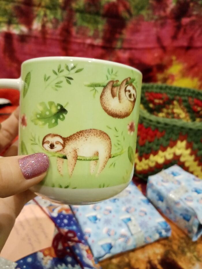 Разглядим поближе. Крутая смешная кружечка с ленивцами. Очень удобная. Я тут же разжаловала свою старую кружку и налила чай в новую:)