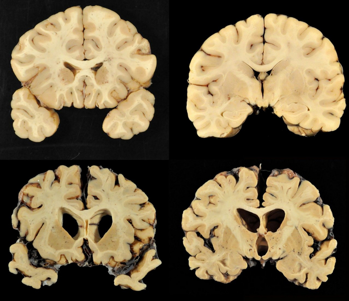 Срез здорового мозга (сверху), срез мозга с губчатой энцефалопатией (снизу)