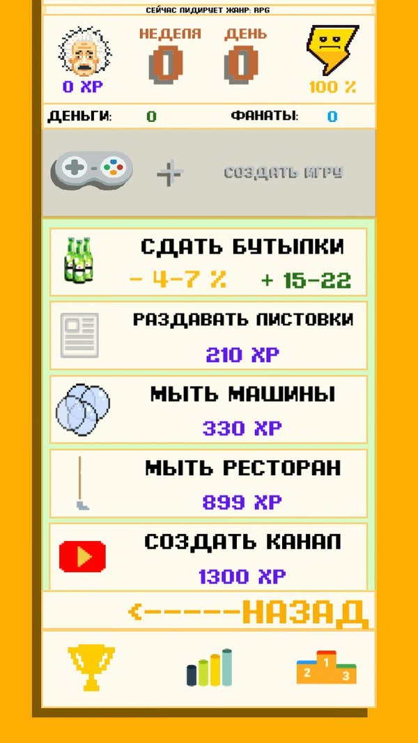 Всё началось в прошлую субботу. Десять минут дороги домой и разговоров о несправедливости жизни привели нас к идее создания игры в максимально короткие сроки с максимальной отдачей проекту, так сказать, марш-бросок в мир геймдева. Тематикой мы выбрали симулятор, а если быть точнее, - симулятор разработчика видеоигр (Воу, как оригинально). Проект планировался как сочетание компьютерной игры Game Dev Tycoon и всеми любимого Симулятора бомжа. На самом деле мы планировали назвать это "Выходным марафоном", т.е. ограничить себя во времени в рамках двух дней и выкладывать игру в том качестве, в котором она была на тот момент. И плавно она перешла в трёхдневный четырёхдневный пятидневный марафон. Знаете, как это бывает: вроде всё красиво и нормально, но ведь можно и лучше, и тут немного криво, а вот тут лучше чуть-чуть увеличить, в общем, классика жизни.