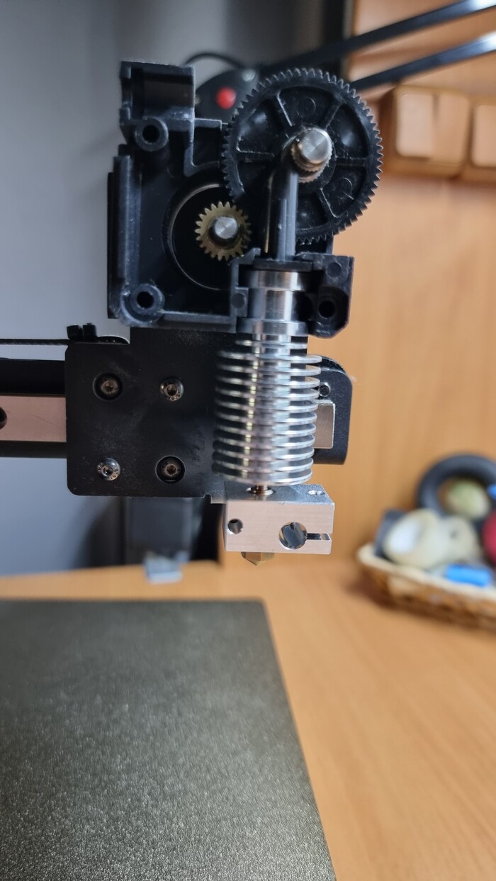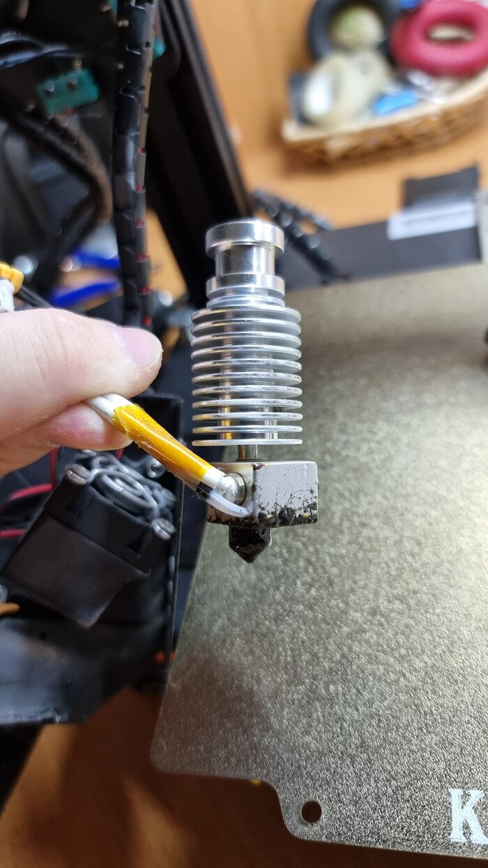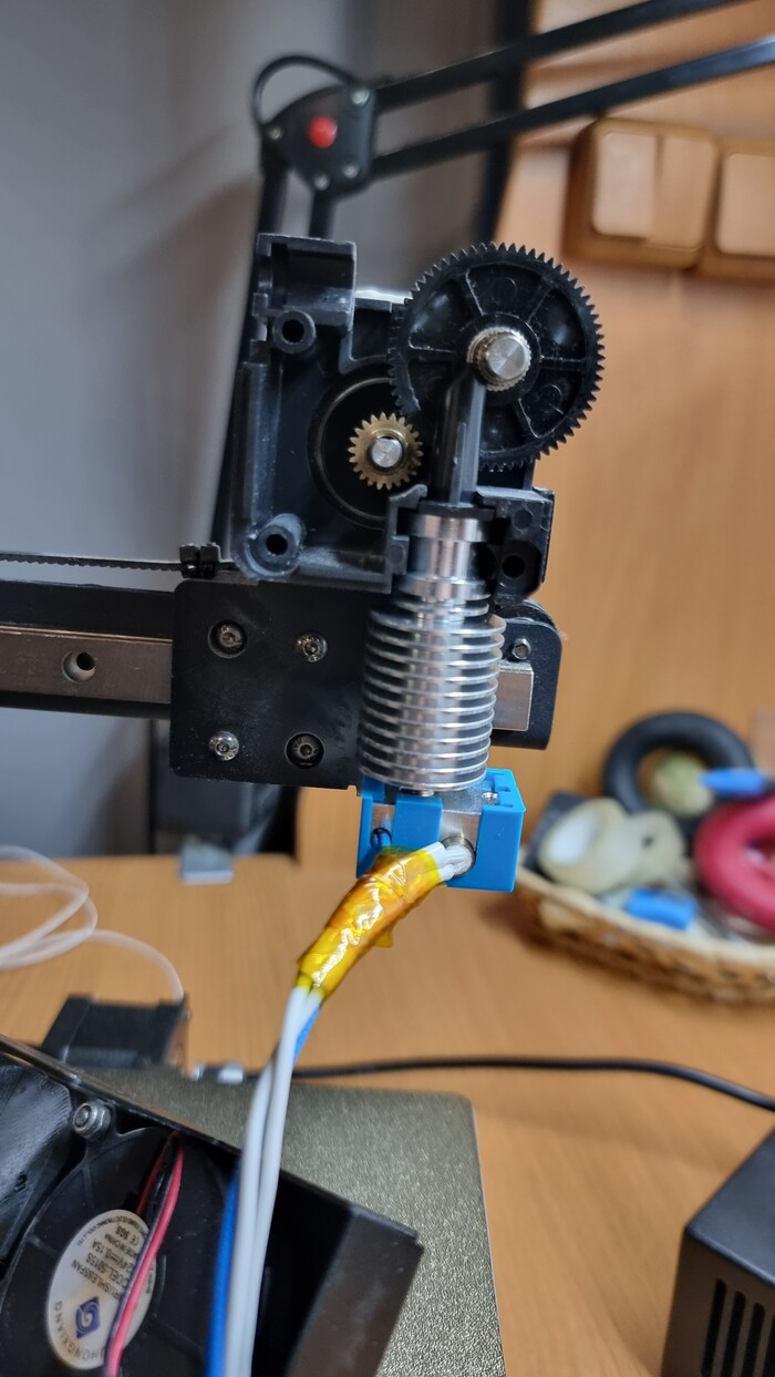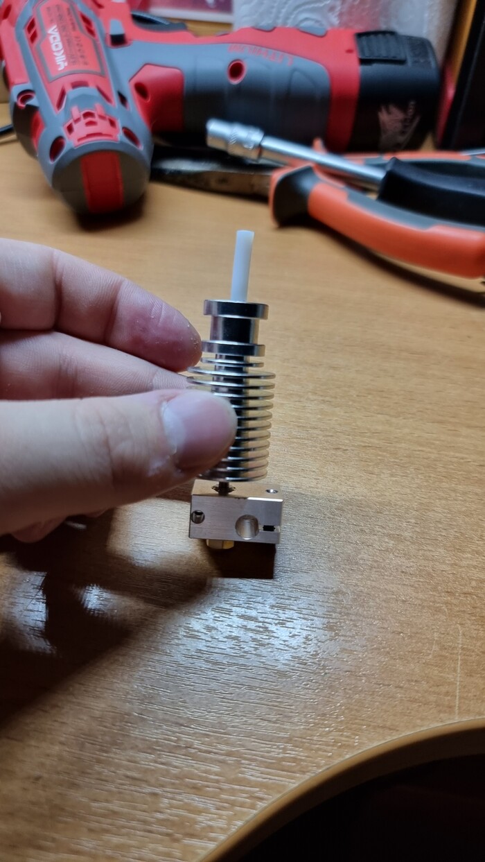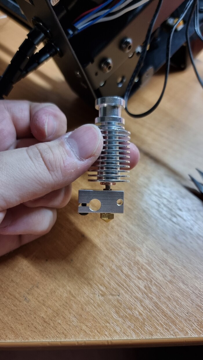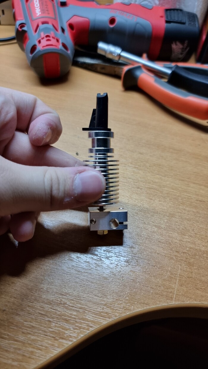 Смотрим на хотэнд. С виду e3dv6, но это только с виду... Я даже примерно не знаю что это, как это зовут и где искать например горла с резьбой м6, поэтому проще просто выкинуть всю горячку целиком. Разбираем фидер, вынимаем