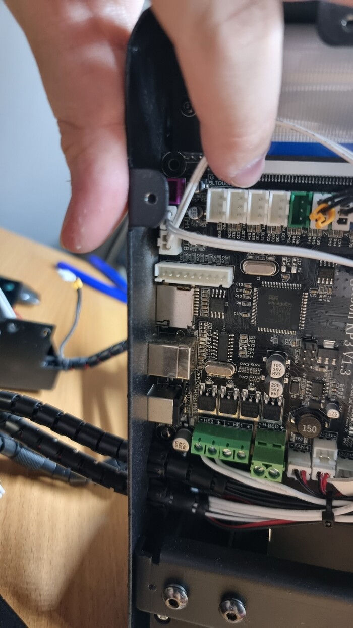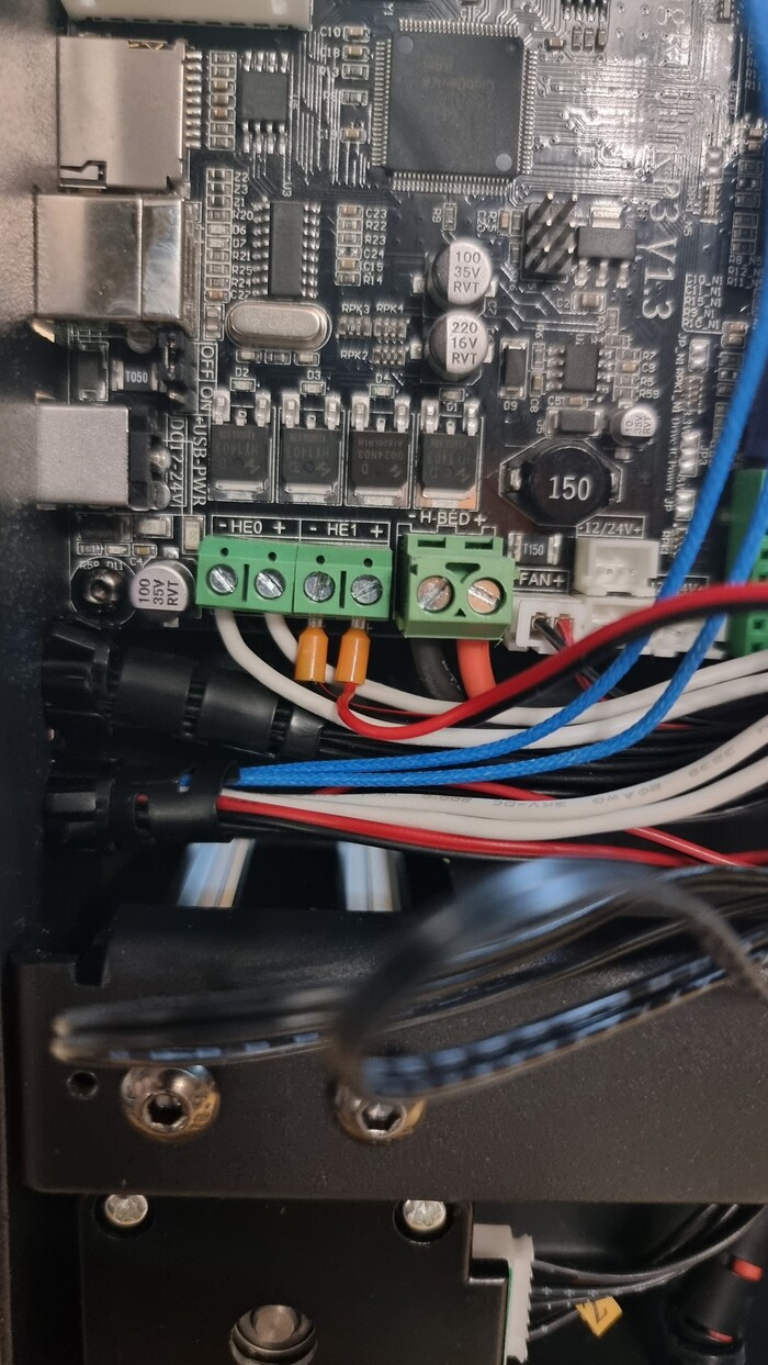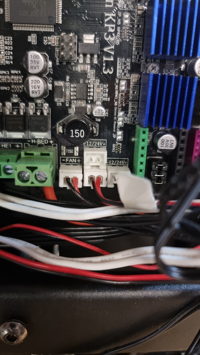 Тут нам нужен вот этот провод, подключенный в один из "двойных" разьемов 24в. Это провод вентилятора радиатора. Обрезаем его разьем и подключаем его в свободный клемник на плате, под второй нагреватель. Затем в прошивке надо переназначить этот выход на вентилятор, и вуаля, у нас есть еще один отключаемый вентилятор, который можно настроить, скажем, на простой при температуре менее 50 градусов