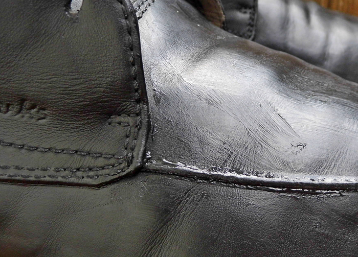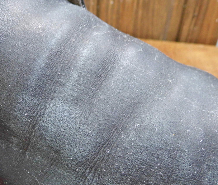 Этот белый след был вынесен паром из толщи кожи. Это место, которому досталось больше пара — сама складка и около. Нам не особо интересно, что это, просто уберём. Применим Средство №3. Оно более зверское, чем Средство №2, используется как обезжириватель перед покраской. Как видим, убирается всё лишние и даже немного краски.