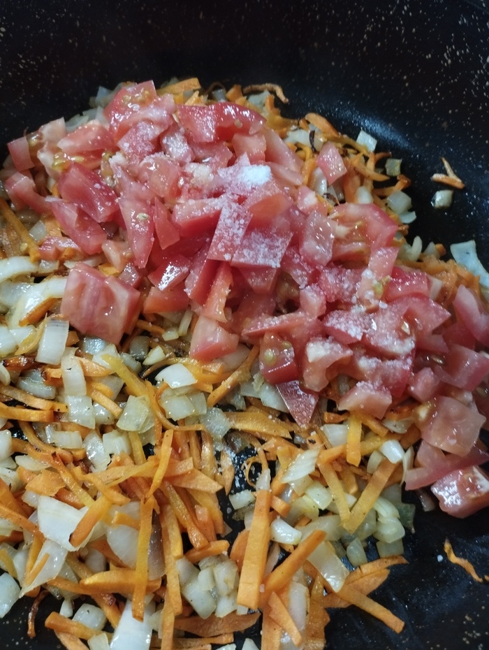И ни в коем случае не ворошите основу хотя бы пару минут! Дайте луку с морковью именно пожариться, только после добавляем томат или томатную пасту.