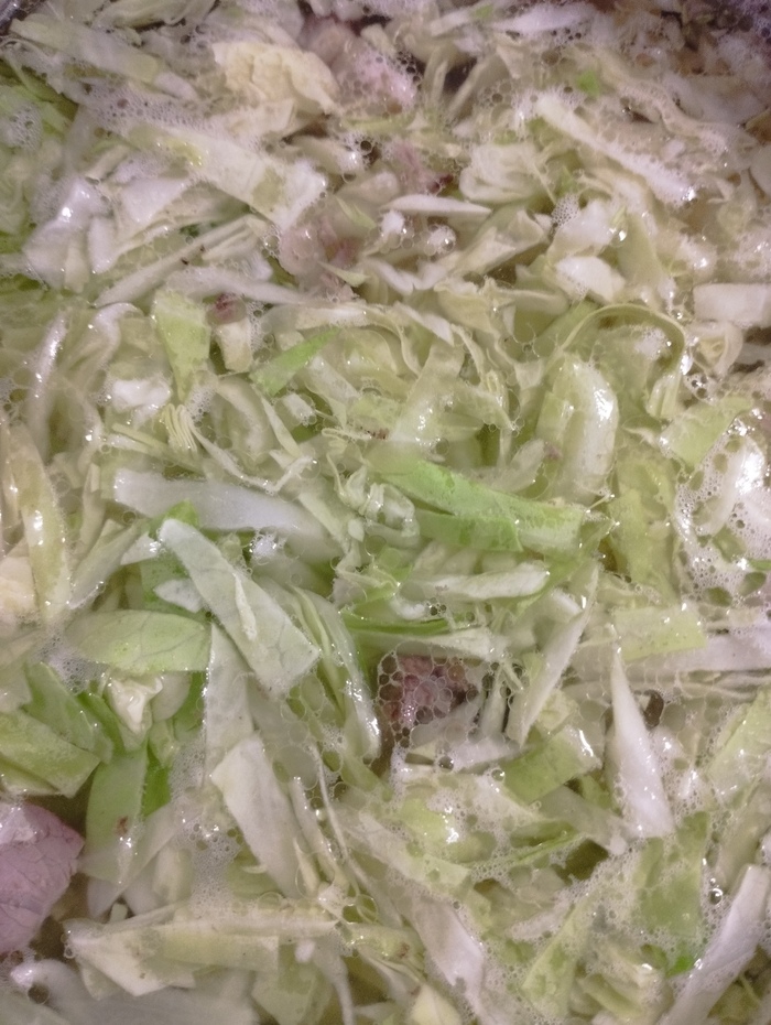 Когда зажарка готова, бульон проварился хотя бы 2 часа, вылавливаем и оставляем остывать мясо. И закладываем картофель нарезанный как вам нравится, а следом капусту нарезанную опять-таки как вам нравится.