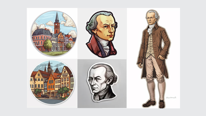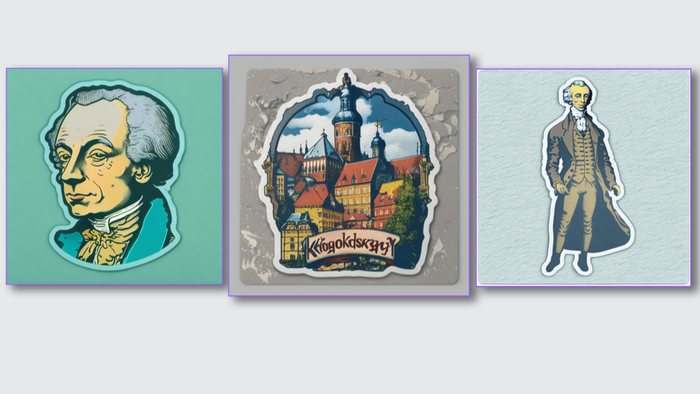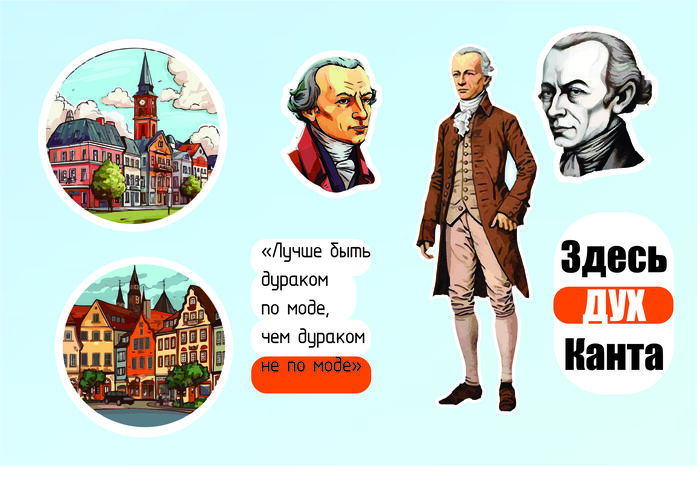 Идем в поисковик и вдохновляемся цитатами И.Канта, выбираем пару подходящих под современность. По диагонали смотрим информацию про Кёнигсберг (Калининград). и накидываем 3 типа стикеров: