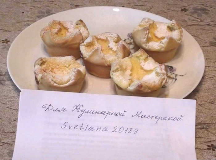 Поместить заготовки в форму, прижимая их ко дну и бокам ячеек формы. Разложить крем по ячейкам с тестом. Прижать уголки теста к крему.