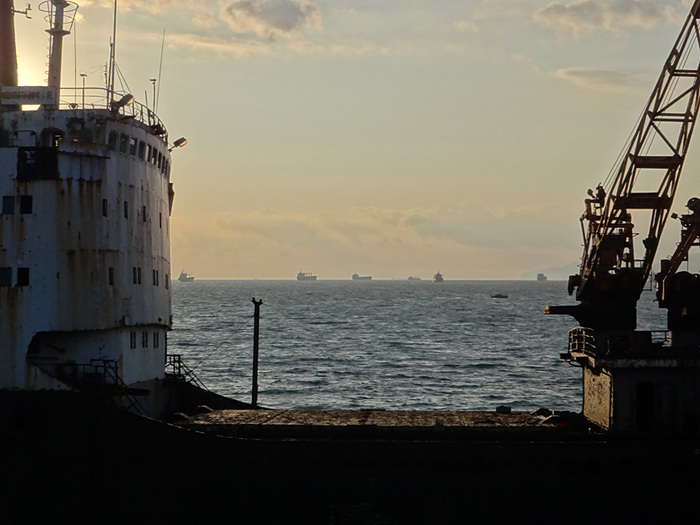 ... но вот прошлым летом все необходимые условия совпали и я предпринял попытку забраться на корабль по якорным цепям, которые были натянуты в сторону моря. Отправился к ним вплавь, но когда подплыл понял, что с берега эта затея обмачиво казалась выполнимой, нежели сейчас, когда я находился под ними и обнаружил, что верхняя часть цепей была густо обмотана колючей проволокой. Перспектива мокрым висеть на обгаженной бакланами и чайками цепи и разматывать руками клубки колючки меня не прельщала, и я поплыл обратно попутно осматривая другие возможности залезть.