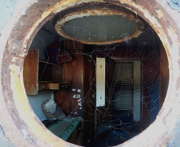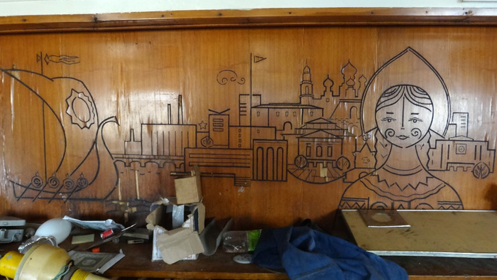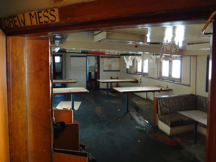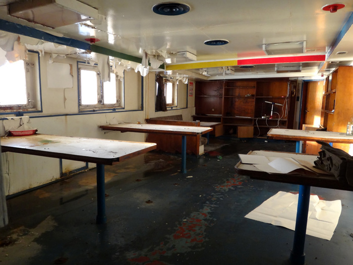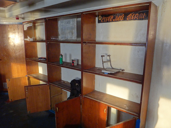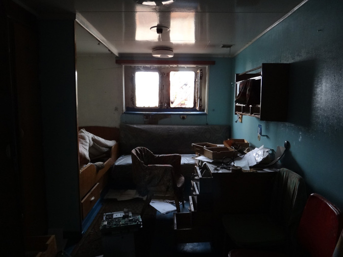 А по соседству расположилась кают-компания с разбитым просто в щепки пианино и кучами мусора и тут начала проявляться русская душа корабля, которую не скроешь под басурманскими надписями и мусором