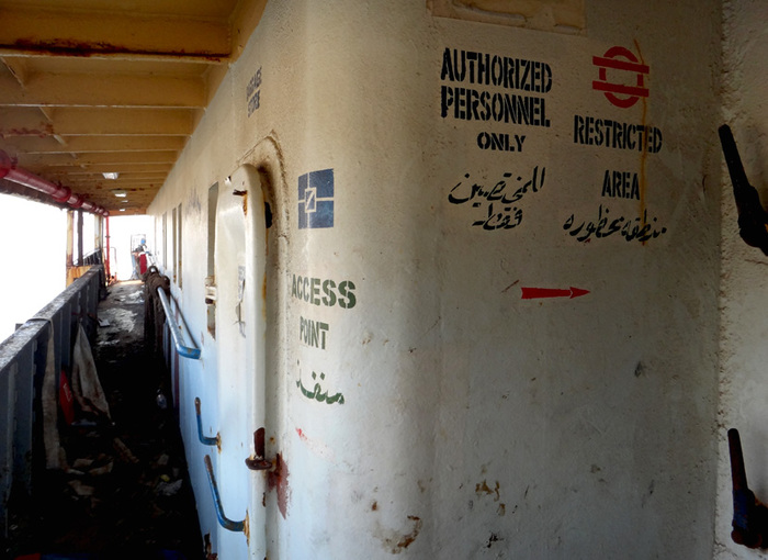 Многие надписи на корабле дублируются на арабском языке, а, видать, для особо запущенных случаев, где и так все понятно - писались новые только на арабском