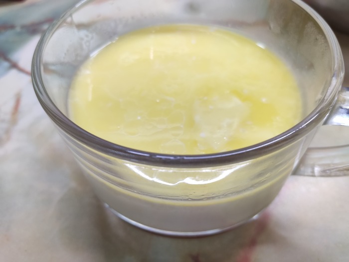 Растапливаем сливочное масло в микроволновке, подогреваем молоко. Смешиваем молоко с маслом. Добавляем яйцо к молоку. Перемешиваем до однородности венчиком.