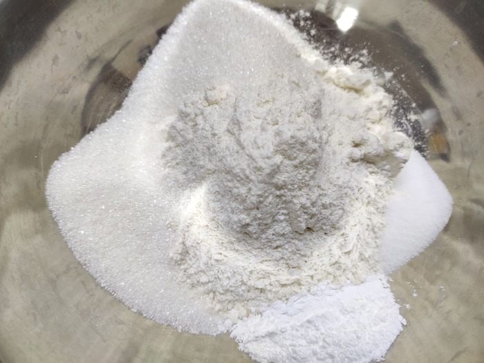 Смешиваем 195 грамм муки, 2 ст.л. сахара, 1 ст.л. разрыхлителя.