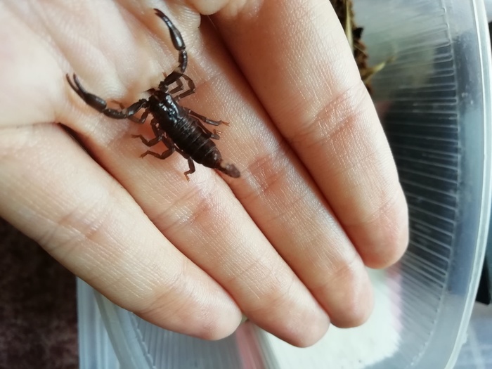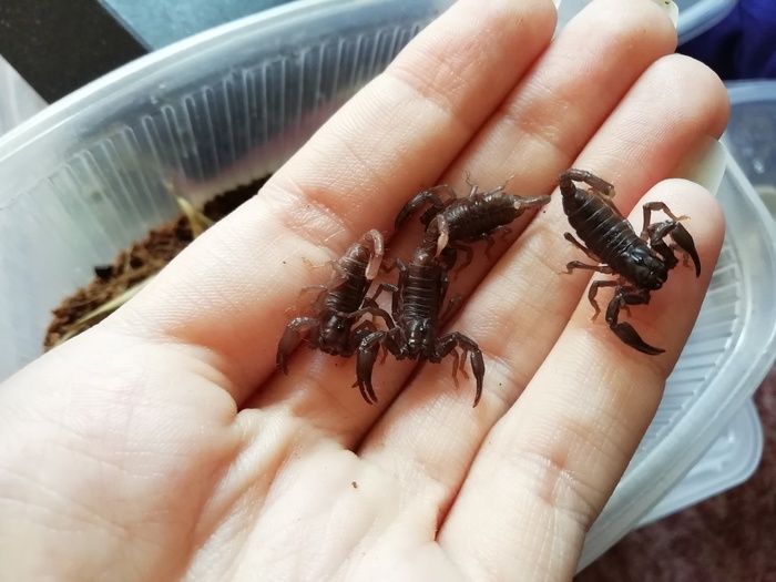 Меня спрашивали за скорпионье семейство. Ну, мелочь успешно полиняла и разбрелась с мамаши. После чего я их переловила, рассадила небольшими группами по 3-4 козявки в плошку. Мелочь всячески демонстрировала, что они - страшные и опасные скорпионы! В общем, пугали, как могли, но быстро привыкли. Стали потихоньку чернеть, ели предварительно убитых тараканов и активничали по ночам. Итого вышло 12 козявок. Скорпионьё было успешно распродано за три часа, правда, самку я тоже продала заводчику. Не моё всё же...