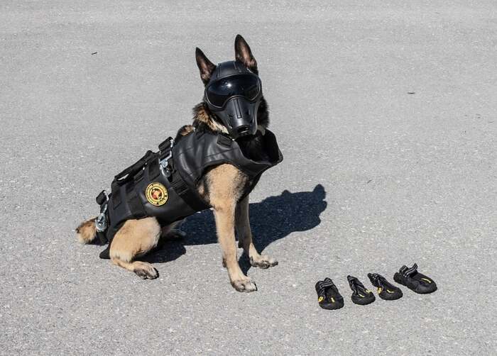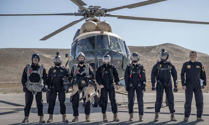 Бельгийская овчарка Мака из поисково-спасательного отряда принимает участие в тренировках по прыжкам с парашютом
