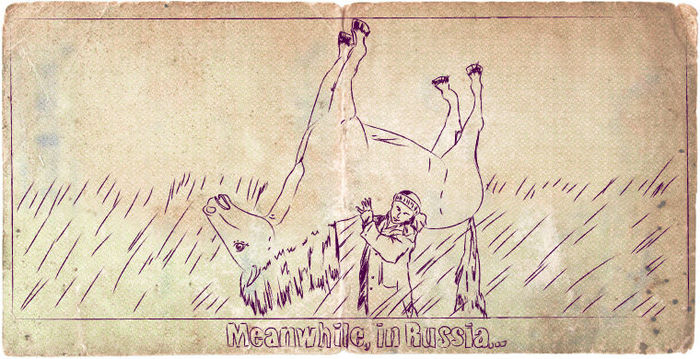 Под этим тегом во Всемирной сети найдутся тысячи картинок и видео о сrazy Russians («сумасшедших русских») — их повседневной жизни и поступках, которые поражают воображение иностранцев. Справедливости ради надо отметить, что мем актуален и для других стран: американцы рисуют картинки meanwhile in Сanada, весь мир — meanwhile in USA и т. д. Кроме того, в них можно узреть и комплименты нашей нации: чего стоят одни лишь веселые голые люди на фоне льда и снега.