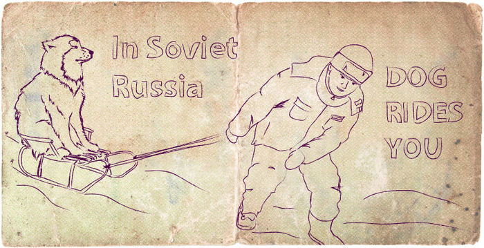 В США до сих популярен еще один мем про Россию — in Soviet Russia. Под ним также постятся картинки о странной стране, в которой еще не изжил себя коммунизм, и о людях, еще не доживших до демократии. Постер обычно сопровождается шуткой-перевертышем, основанном на игре слов и мнении, что в России все шиворот-навыворот. Типичная шутка выглядит так: «В Америке вы ловите рыбу, в советской России рыба ловит вас». И далее тысячи вариаций в том же духе: «В Америке вы слушаете радио и смотрите телевизор, а в советской России радио слушает вас, а телевизор наблюдает за вами».