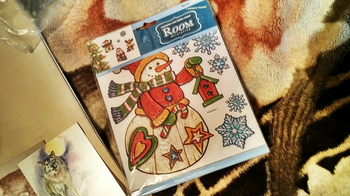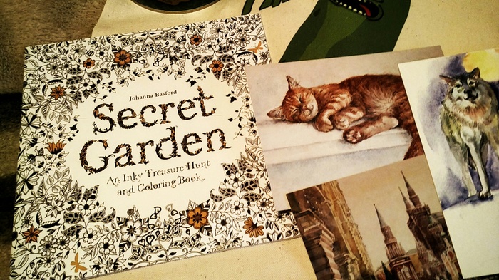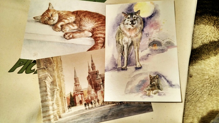 А ещё в посылке были: великолепные акварельные открытки (особенно с волком, я просто влюбилась), разукрашка и милые новогодние наклейки, которые я утащу на работу :3