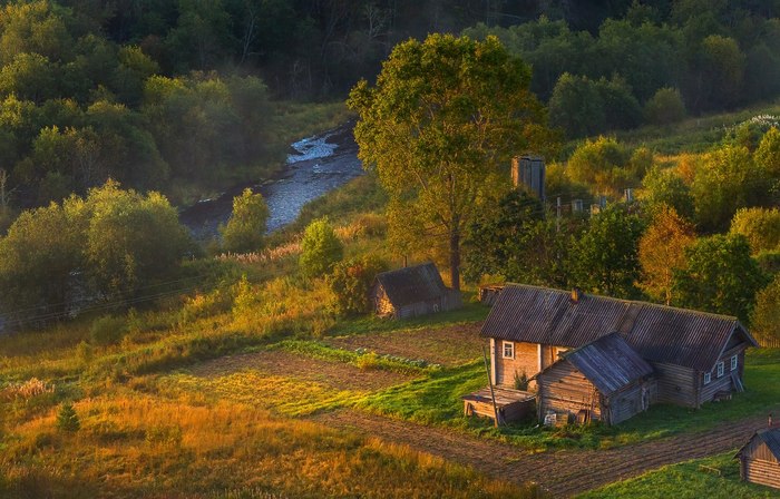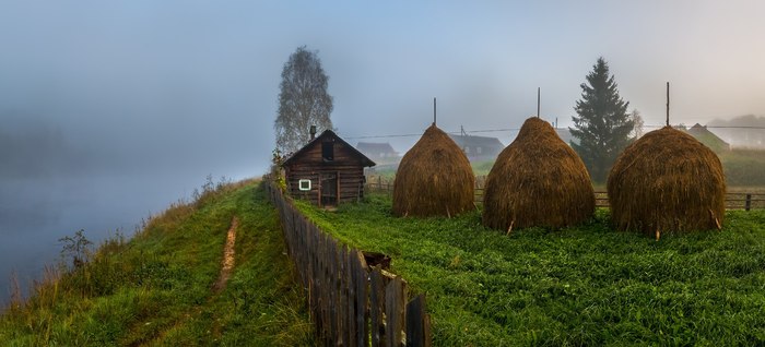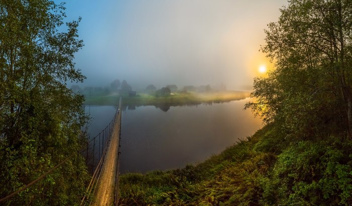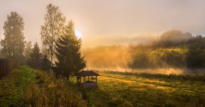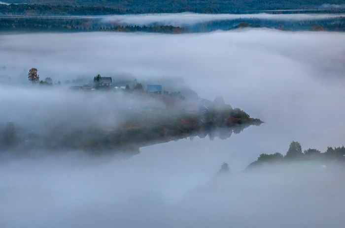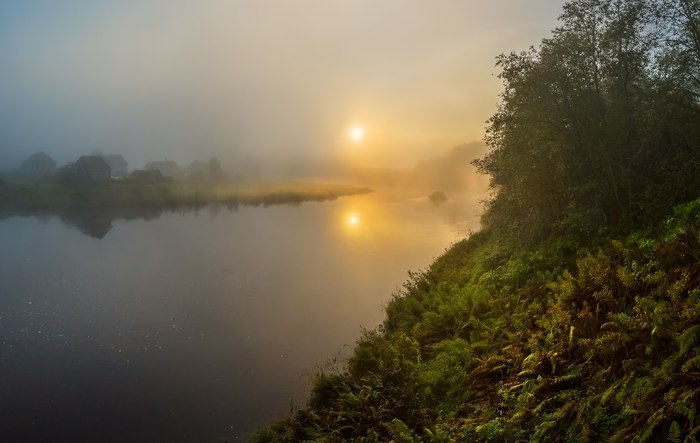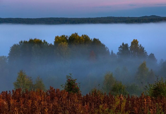 Заря. Густой туман как молочная река покрывал всю долину реки Оять. Хорошо, что съёмочную точку заранее выбрал на холмах. Получилось эту красоту увидеть со стороны, а на переднем плане осеннее разноцветье иван-чая.