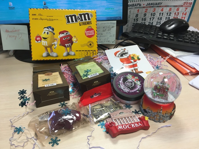 Подарок классный! Моя снегурочка со всем угадала) Красивенный снежный шарик и магниты в коллекцию. Чаи пахнут просто обалденно! Сразу на работе заварили и попробовали, всем понравились) Пили с вкусняшками из подарка) Крем и мыло от The body shop, нравится эта марка.
