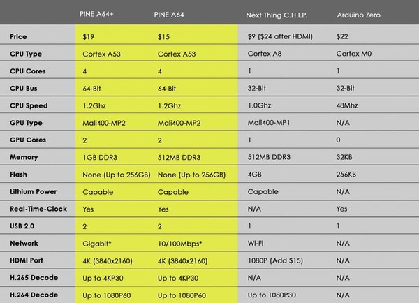 Создатели предлагают две версии дешевого компьютера, наиболее существенным отличием которых является объем оперативной памяти: у модели A64 на борту 512 мегабайт, а у A64+ — один гигабайт (версия с 2 ГБ обойдется еще дороже). Старшая модель также получит порт Gigabit Ethernet, разъем для подключения камеры, интерфейс MIPI и порт для подключения сенсорной панели. В компьютере нет встроенной флеш-памяти, но предусмотрен слот для карты microSD вместимостью до 256 гигабайт.