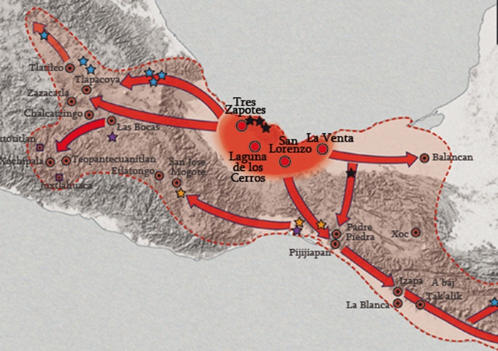 Сабж в 600 году до н.э. выделен бледно-оранжевым. Сегодня считается, что за всё время своего существования с 1500 по 400 гг. до н.э. ольмеки не селились за пределами обозначенной территории, что не мешало им распространять своё культурное влияние на тысячу километров.