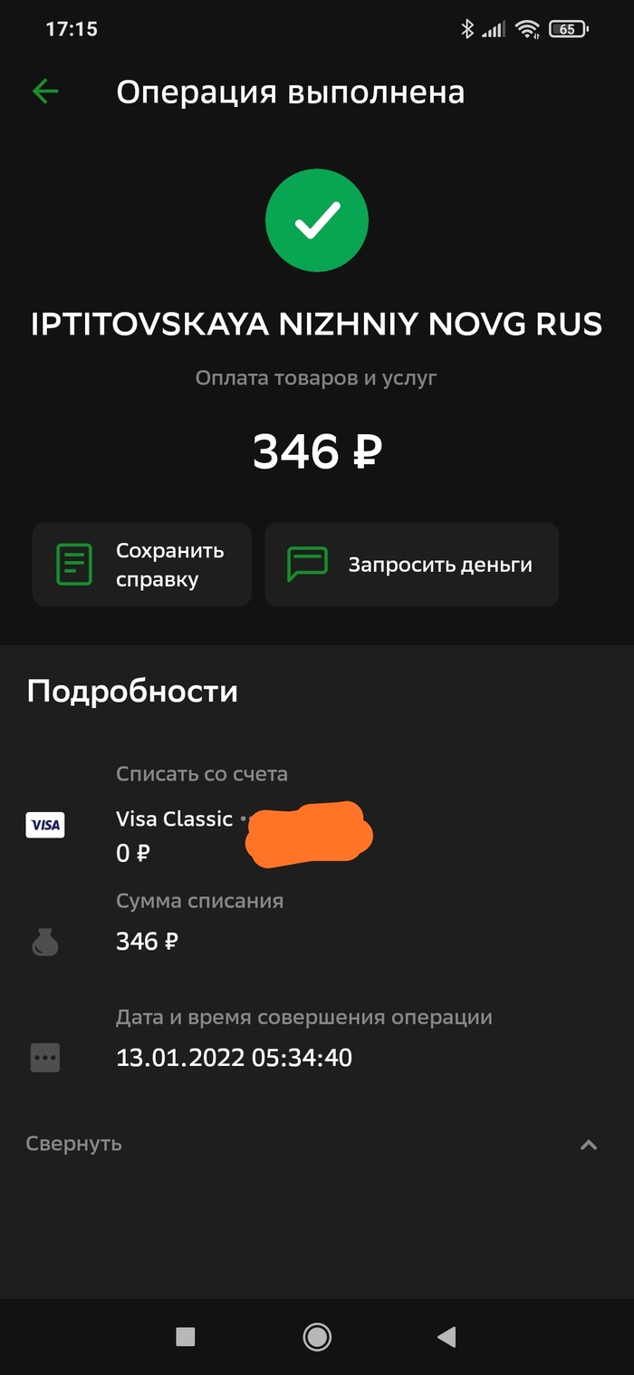 Проверяя историю в приложении Сбербанка обнаружил непонятные транзакции. Посмотрев на время когда они происходили, заподозрил неладное, т. к. в это время я находился дома. Позвонив в поддержку банка мне сказали что это транзакция через "прикладывание". В отделении, на следующий день сказали тоже самое и мол " обратитесь в полицию". Может быть кто нибудь сталкивался с чем нибудь подобным и сможет разъяснить что делать? Может быть как то можно определить что это за IPTITOVSKAYA NIZHNIY NOVG RUS?