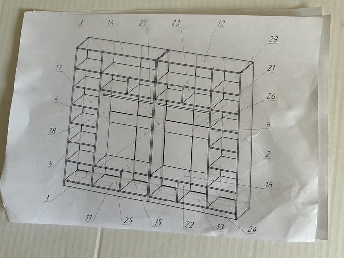 Начинаем звонить в номер для обратной связи, телефон берут только в отделе продаж, где нас отправляют в гарантий отдел. Пока жена звонит туда, мы с товарищем начинаем сборку, благо среди бумажек нашлась общая схема сборки, пусть и не очень информативная, но номера на ней совпали с номерами на деталях и работа пошла. На низкое качество деталей шкафа в процессе сборки было как-то пофиг, до определенного момента: на одной из полок, которая была с такой же нумерацией как и другие полки, кромка внезапно оказалась сбоку (Она не квадратная, если провернуть по-другому не встанет)