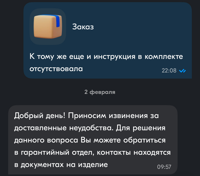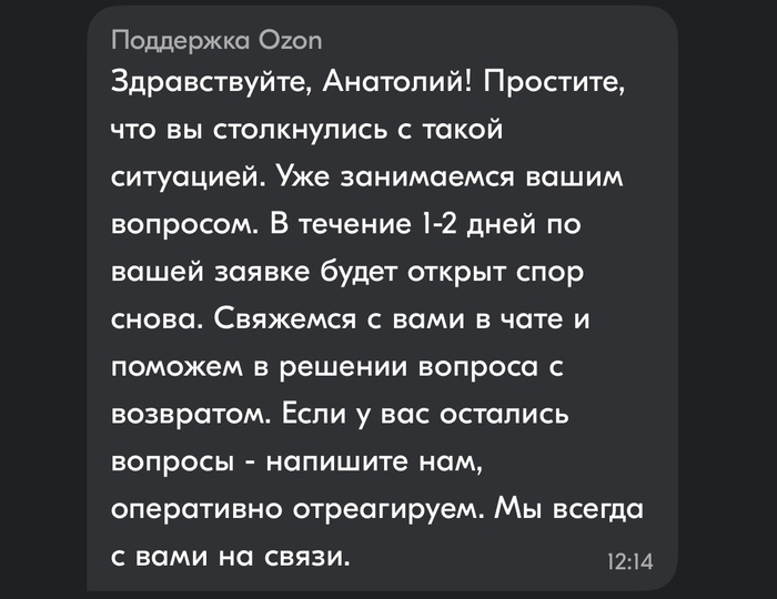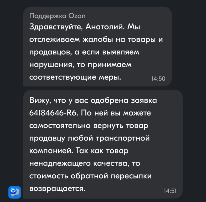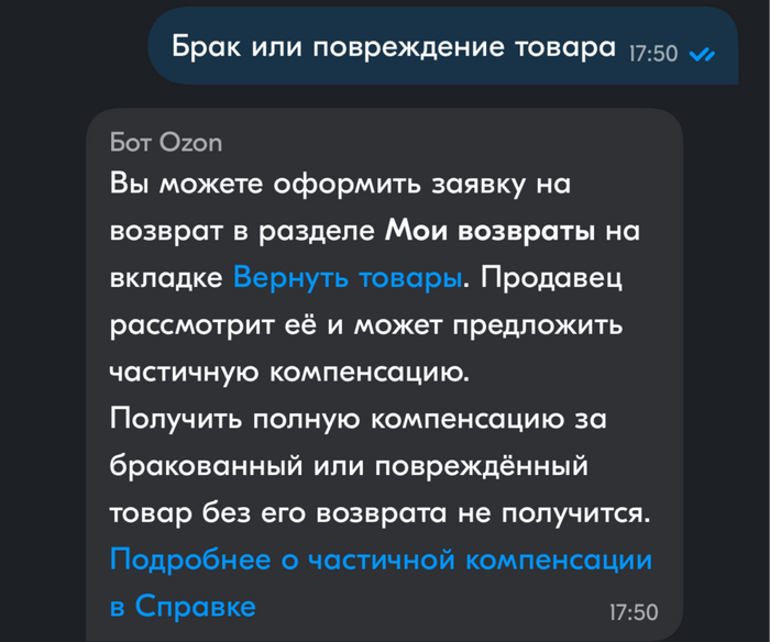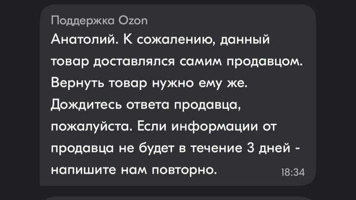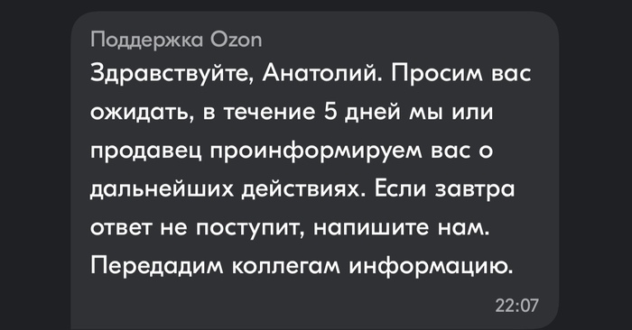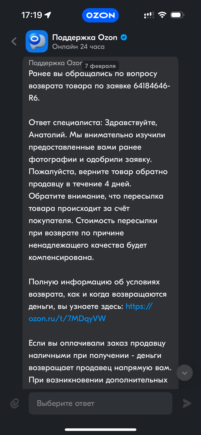 Но ответа не последовало. Разозлившись начал долбиться в техподдержку @Ozon, там бот завернул меня с тем, что если имеете претензии по вопросам качества товара оформляй возврат.