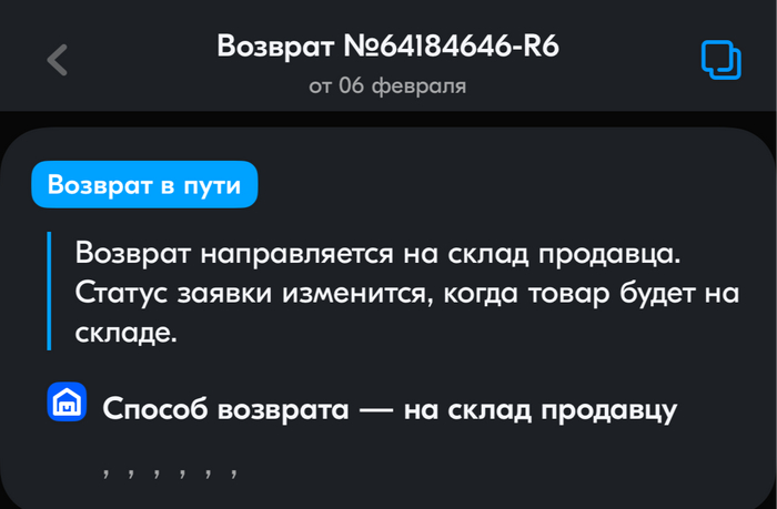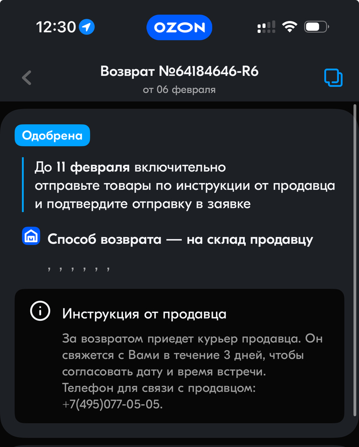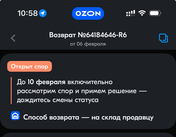 Вернемся к возврату. Продавец молчит как рыба, трубку не берет, часики тикают, для самостоятельной отправки товара продавцу нет адреса - отправляй на деревню дедушке, есть только ",,,,,,", продолжаю долбить поддержку озона, от кормления завтраками удалось добиться открытия второго спора, и уж тут то доблестные сотрудники озона смогли достучаться до продавца, который клятвенно обещает забрать шкаф и связаться со мной в течение ближайших пяти дней. И последовали изменения, на карточке возврата появилось, что возврат уже в пути