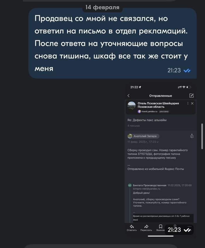 Смотрим в документы, вижу номер телефона, пытаюсь дозвониться 0 реакции, продажники отвечают и говорят: у вас там среди документов лежал гарантийный талон, в нем есть почта, напишите туда. Ок, там было указано два адреса электронной почты zakaz@bintaga.ru и bintpro-rekl@yandex.ru, написал и туда, и туда.