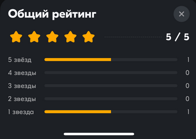 Чтож, оставляю негативный отзыв, в этот момент замечаю как интересно считается рейтинг, если у товара 2 отзыва, один на 5 звезд, второй на 1 звезду, итоговый рейтинг - 5 звезд