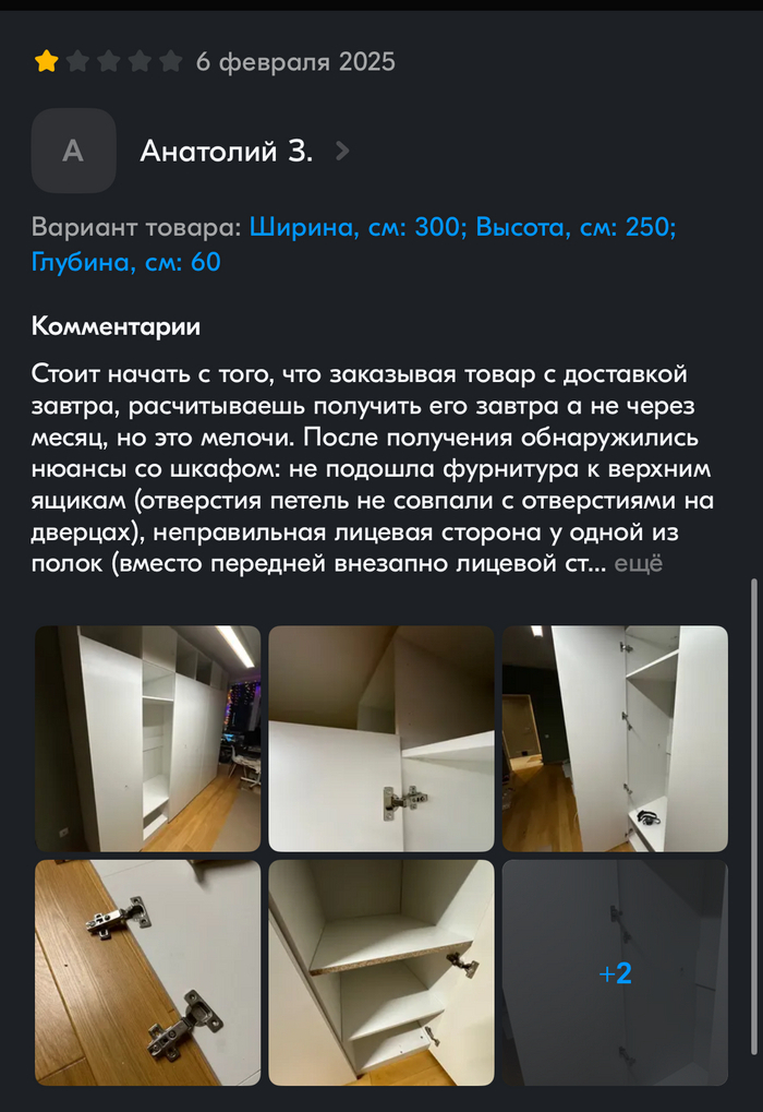 Но от дальнейших действий продавца меня бомбануло еще сильнее: карточка с которой я заказывал шкаф внезапно перестала быть активной "Товар закончился у продавца" и внезапно появилась абсолютно точно такая же карточка, с теми же золотистыми ручками, но уже без негативного отзыва. Вот ссылки: моя и актуальная на момент написания статьи. Пробить было легко, всего лишь вбил то же самое название. И вуаля, положительный отзыв остался, а негативного и не существовало никогда.