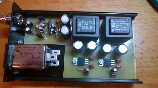 ЦАП собран на DIR9001, PCM2407 и AD1852. Так же в цапе есть усилитель для наушников. На выходе цапа стоят поганые операционники OPA2134. Почему их любят китайцы для меня загадка. Но разработчиков данного аппарата можно и похвалить. Они заложили отдельные стабилизаторы для аналоговой и цифровой частей AD1852, а так же поставили хорошие электролиты nichicon. Питание ЦАПа происходит при помощи однополярного блока питания на 15 В. Далее для получения двуполярного напряжение используется мощный операционный усилитель (на фото он стоит на радиаторе). Соответственно получаем -+7,5 В на питание операционников и усилителя для наушников. Значит можно сделать раздельное и вкусное питание для данного ЦАПа. Нехитрым способом измеряем потребляемые токи (благо ферритовые фильтры позволяют это делать) и прикидываем, что будем использовать. В барахле завалялся хороший алюминиевый корпус. В качестве трансформаторов питания выбрал продукцию фирмы HANH. Стабилизатор для оу и ушника собираем на M5230 с парочкой транзисторов. Для остального на lm317. Рисуем и изготавливаем плату.