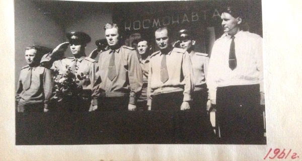 А вот фото, сделанное моей бабушкой после. Гагарин — второй слева, выполняет воинское приветствие.