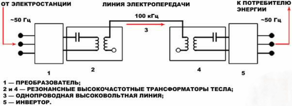 Система называется "резонансный метод передачи энергии" — два резонансных контура, принимающий и передающий, соединены однопроводной линией. Для этого мы берем обычную электроэнергию электросети, преобразуем ее в переменный ток высокого напряжения с частотой около ста килогерц и подаем на передающий резонансный контур — трансформатор Тесла. С этого контура энергия идет по тонкой однопроводной линии к потребителю, там ее встречает второй аналогичный резонансный контур — приемный, с которого мы энергию снимаем и преобразуем в привычный для большинства электроприборов вид — 220 В 50 Гц или трехфазный ток 380 В.