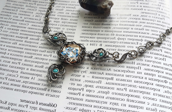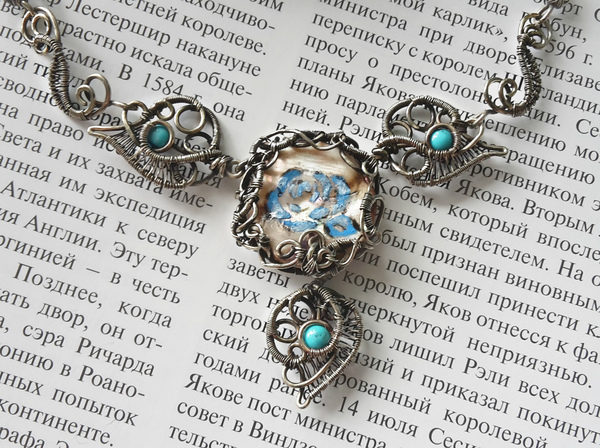Выполненное из нейзильбера, это маленькое изящное колье просто создано для открытых плеч, хотя прекрасно будет выглядеть и с офисной блузой) В центре его - кабошон перламутра с ручной росписью, которая и натолкнула меня на мысль о фарфоре, алебастровой коже графини и светских раутах Средневековья. Колье патинировано и отполировано.