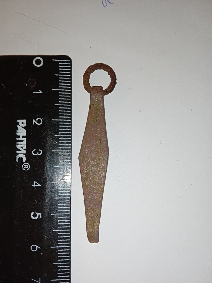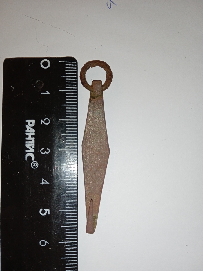 Всём привет. Сегодня ловил крупных щук, они кстати не пострадали, и решил пройтись с мд по лесочку у берега. Нашёл приятную вещицу-старинная блесна. Жало без бородки. В нете пишут, что такие делали раньше, чтобы рыбу снимать быстрее. И форма то классическая-ромб. Окуневая. Осталось восстановить и разловить. Какой век не скажу, но думаю 18-19. Вроде латунь, или медь, я ещё пока не разбираюсь, колечко железное.