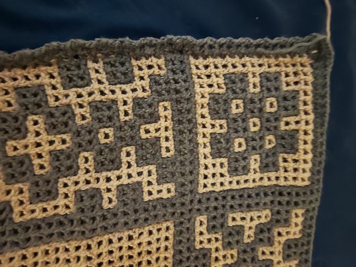 Первая работа в этой технике. Получается прикольно, но очень муторно вязать такие большие вещи, потому что каждый ряд проходишь дважды.