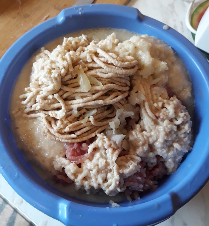 Дальше время лука, чеснока и хлеба. Хлеб был замочен в воде - потому столько жидкости в фарше.