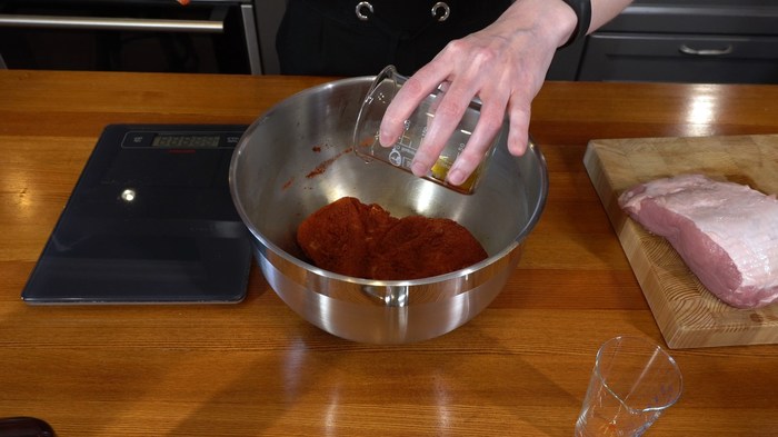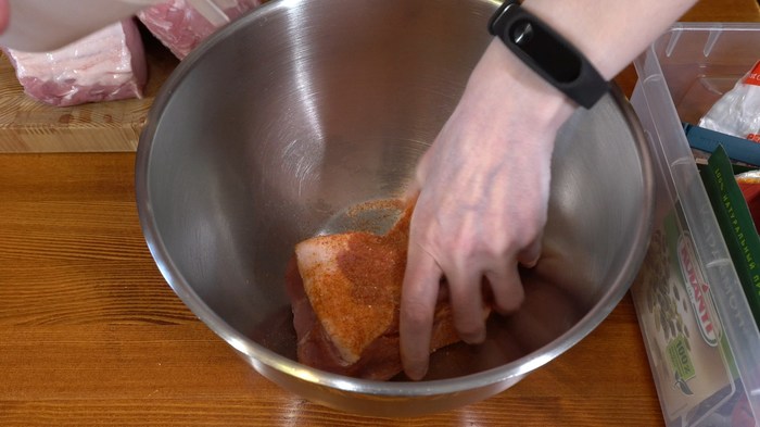 Каждый кусок взвесила на весах и относительно конкретного веса на весах для малых весов отмерила специи, нитритную соль и фосфаты.