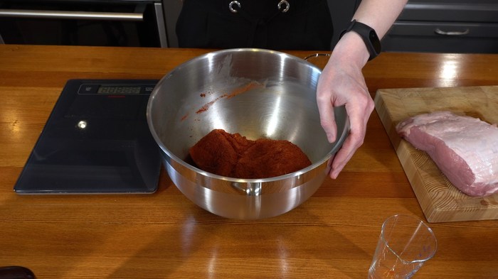 Неизменной для каждого куска оставалась пропорция нитритной соли и фосфатов. Нитритную соль использовала в соотношении 2 % от веса мяса, а фосфаты - 3 г на 1 кг мяса. Специи для каждого куска выбрала разные. Для того, чтобы специи не превращались из порошка в пасту под воздействием влаги мяса, я смешала их вместе с солью и фосфатами. Так гораздо легче распределить мелкодисперсный порошок по куску. В ход также пошел жидкий дым. Его использовала совсем чуть-чуть.
