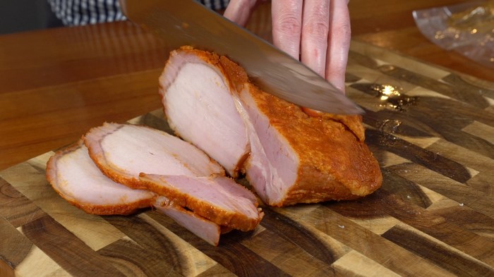 Благодаря нитритной соли ветчина получилась красивого розового цвета внутри. Считаю, что такой вид в разрезе можно назвать товарным. Фосфаты обеспечили сочность. Жидкий дым - идеальное решение, если нет коптильни, главное использовать его в небольших количествах, чтобы аромат дыма не был навязчивым и не забивал рецепторы. Специи также были подобраны правильно и приятно дополнили ветчинный аромат, который удалось получить за счет все той же нитритной соли.