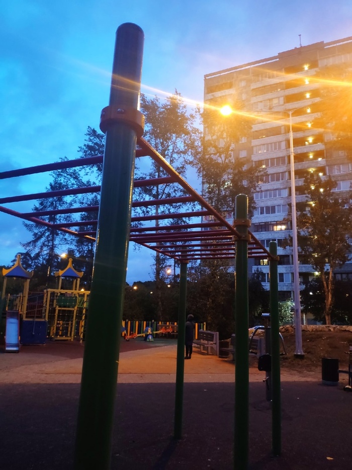 Ну а тренировку никто не отменял, даже вчера с утра не получилось (не захотел), но вечером пока ждал детей из секции поблизости оказалась моя любимая площадка, на ней и позанимался. Без бега, просто с разминкой.