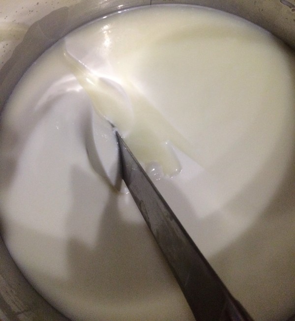 Далее проводим тест на чистое отделение. Визуально вы уже должны увидеть что в кастрюле сгусток, он немного отходит от стенок и на поверхности плавает сыворотка.