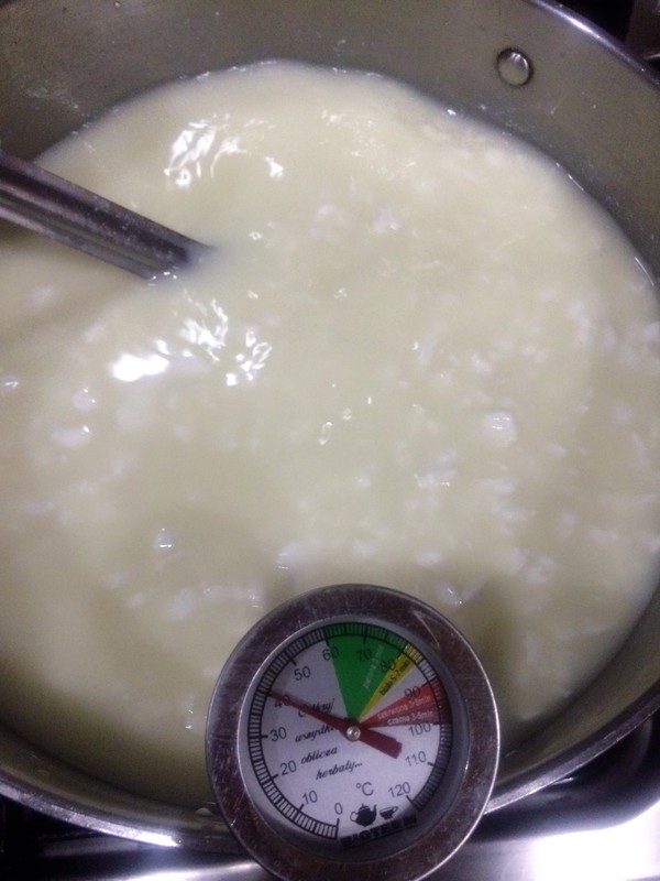 Постоянно поддерживая температуру 85-90 выдерживаем сыр 40 минут( если из коровьего молока) и час если из козьего.
