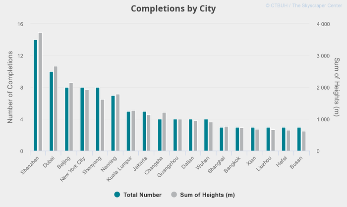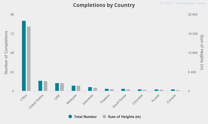 Во многом за счёт Китая большинство небоскрёбов строится в Азии, причём к Азии авторы рейтинга не относят Ближний Восток (в том числе ОАЭ), рассматривая его как самостоятельный регион.